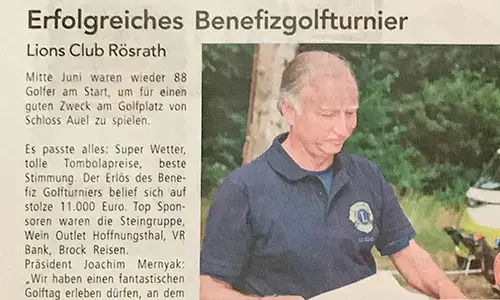 Kleiner Bericht über das Benefizgolfturnier der Lions aus Rösrath, mit einem Spendenerlös von 11.000 ,- €.